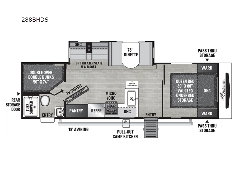 If you're looking for a family-friendly travel trailer, this is the one! The double-size bunks will be perfect for little ones, while you take the front private bedroom with a queen bed. There is also vaulted underbed storage so everything has a place. Within the full bath you'll find one of the dual entry doors for convenience, and the other entry door leads into the combined kitchen and living room. Your crew can dine at the booth dinette or relax on the sofa across from the entertainment center. There is also a hidden pantry behind the TV swivel and plenty of other storage spaces found throughout. The chef of your group will be happy to find a full interior kitchen with a flip-up countertop for more space plus an exterior pull-out camp kitchen with a refrigerator.