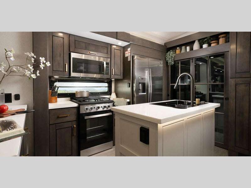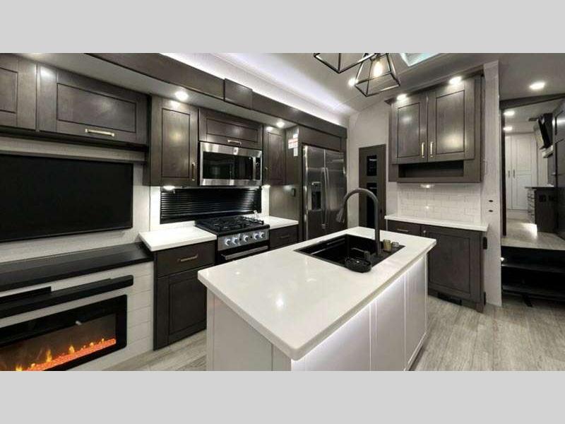 Sleeps 4 Slides 3 Length 40 ft 5 in Ext Width 8 ft 6 in Ext Height 13 ft 3 in Int Height 8 ft 4 in Interior Color Stonewall Gray Exterior Color Opt. Full Body Paint (Ash, Shadow, Glacier Blue) Hitch Weight 2600 lbs GVWR 17300 lbs Dry Weight 14465 lbs Cargo Capacity 2835 lbs Fresh Water Capacity 75 gals Grey Water Capacity 82.5 gals Black Water Capacity 50 gals Tire Size 215/75R17.5H Furnace BTU 40000 btu Available Beds King Refrigerator Type Residential Refrigerator Size 21 cu ft Convection Cooking Yes Cooktop Burners 4 Shower Size 36" x 48" Number of Awnings 2 Axle Weight 8000 lbs LP Tank Capacity 90 Lbs. Water Heater Type On Demand Tankless AC BTU 30000 btu TV Info LR 4K Smart LED HDTV, BR 32" 4K Smart TV Awning Info 15' & 16' Electric w/ Integrated RGB LED Lights Axle Count 2 Washer/Dryer Available Yes Shower Type Walk-In Shower Solar Wattage 400 watts Similar Floorplans
