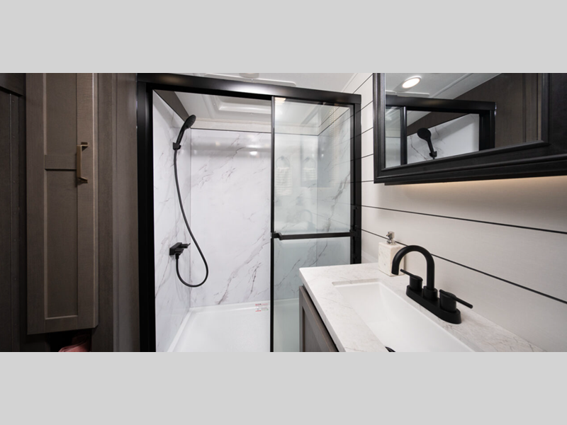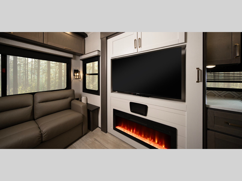 - Core Shield aluminum-framed and vacuum – Bonded laminated gel-coated fiberglass exteriors walls and slideout/end walls
