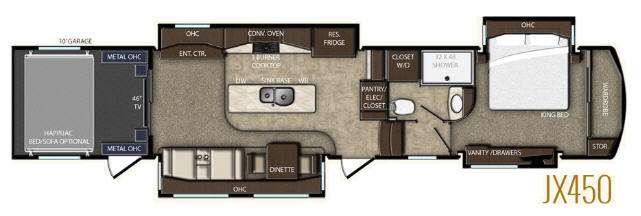 Enjoy luxurious living while you travel in this DRV Luxury Suites FullHouse asset hauler featuring a 10' garage! This fifth wheel toy hauler model JX450 offers quadruple slides for added interior space, a convenient island in the kitchen, plus a 20 cu. ft. refrigerator, dishwasher, and king size bed!