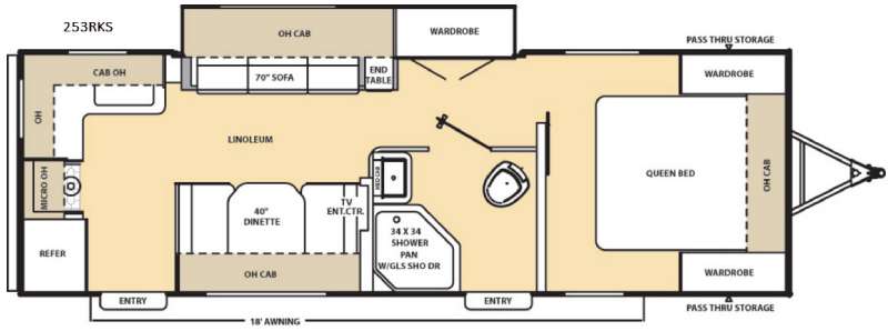 A spacious side aisle bath can be found next to the dinette featuring its own private entry to the outside which is an added convenience when you want to have access when enjoying the outdoors. Inside the bath there is a 34" x 34" shower pan with glass shower door, sink with medicine cabinet, and toilet.
