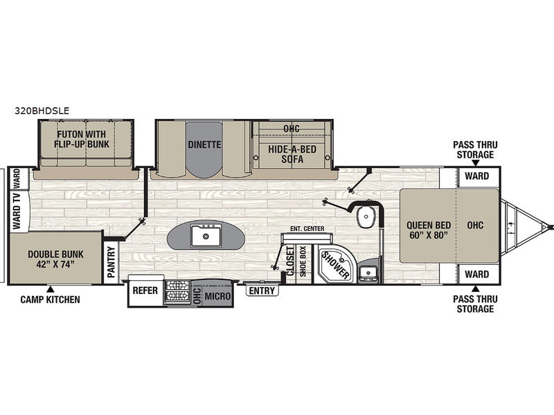 A family of four or even a family of eight can enjoy this travel trailer for years to come! From the spacious kitchen and living area with dual slides to the private bunkhouse with two bunk beds, a futon and clothing storage to an outside awning offering an outdoor living space and a camp kitchen with a grill station, this is the perfect family RV! There is more to see like a front private bedroom, an entry closet, and an exterior pass-through compartment for those larger camping items, plus a few options you can choose to fit your camping lifestyle!